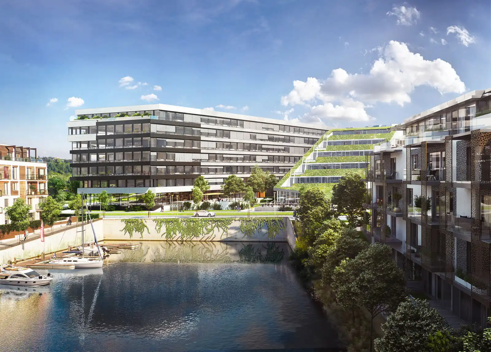 DOCK IN THREE nabízí výjimečné administrativní prostory s terasami celkem na 6. podlažích s výhledem na Marinu. Kancelářský prostor je velmi variabilní a budova je tak vhodná pro firmy různých velikostí. Každý nájemce má k dispozici své oddělené zázemí včetně vlastního vstupu, kuchyňky a toalety. Kanceláře jsou vybaveny nejmodernější technikou, elektronicky kontrolovaným vstupem do jednotlivých pater prostřednictvím čipových karet s 24-hodinovým přístupem 365 dní v roce a přítomna je také profesionální ostraha.